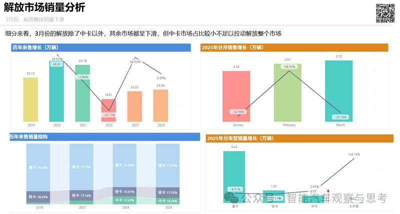 3月,解放中卡销量约2万辆,排名第二,同比下降23.36%,也是前五企业中同比下降**多的企业,市占率18.01%,解放销量下滑的主要原因可能是宏观经济、物流需求等市场环境不确定性增加,前期需求透支,且行业竞争白热化,新兴品牌挤压份额等多重因素共同导致销量下滑。